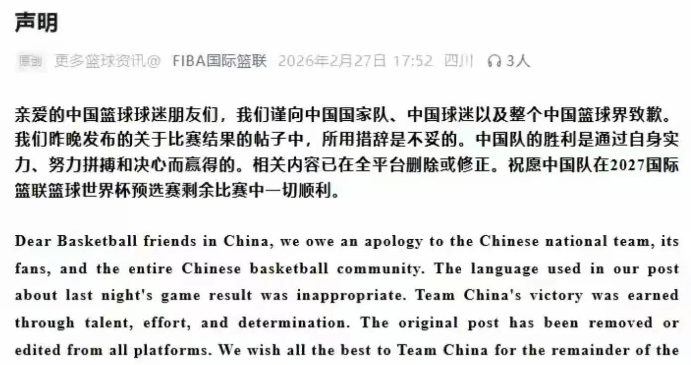 FIBA的补救操作,说白了就是迫于舆论压力的权宜之计,根本不是真心认错,在全网声讨的浪潮下,2月27日,FIBA终于发布了中英文道歉声明。